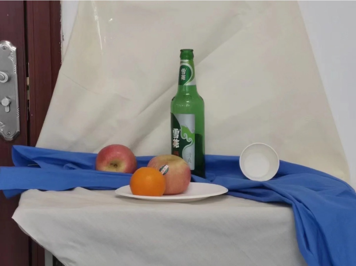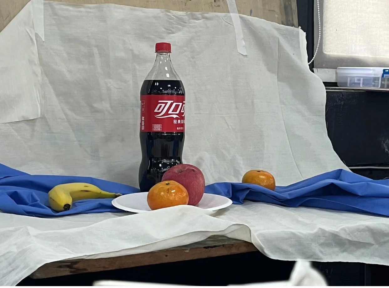 色彩静物写生:两条衬布(一白一蓝)可口可乐1l一瓶,两个橙子,一个苹果,一个香蕉,一个白色圆形盘子