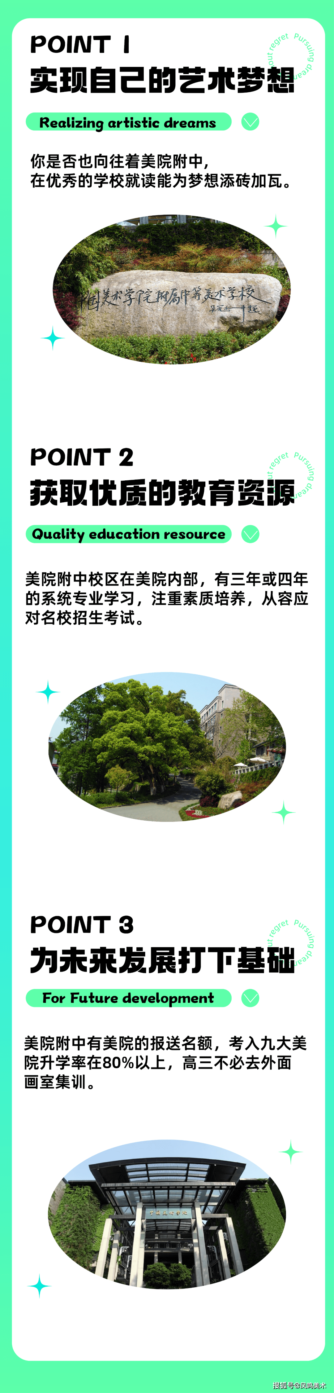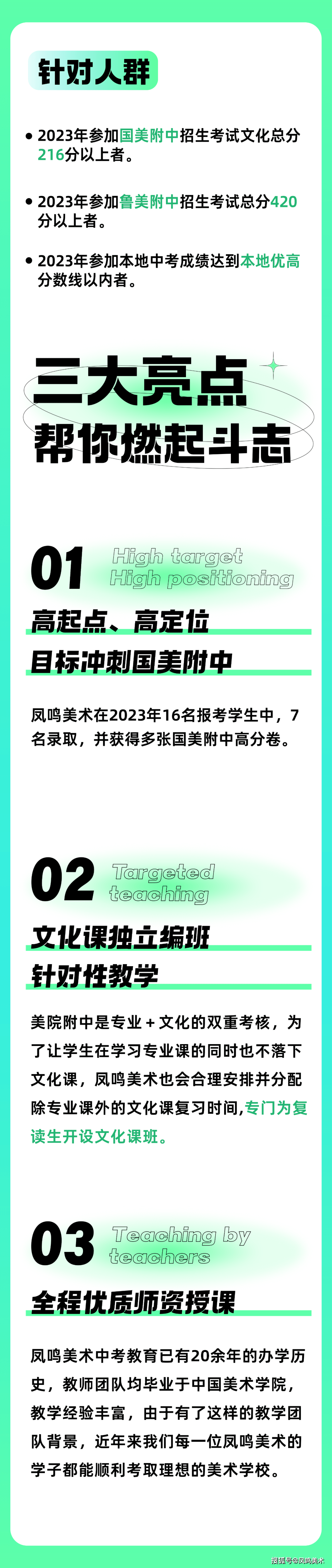 针对不一样的人群,我们有更精准的复读生计划。 三大亮点,点燃学生的斗志:高起点、高定位,冲刺国美附中不是梦;针对性教学、文化课也得跟上;全程优质师资授课,有问必答!