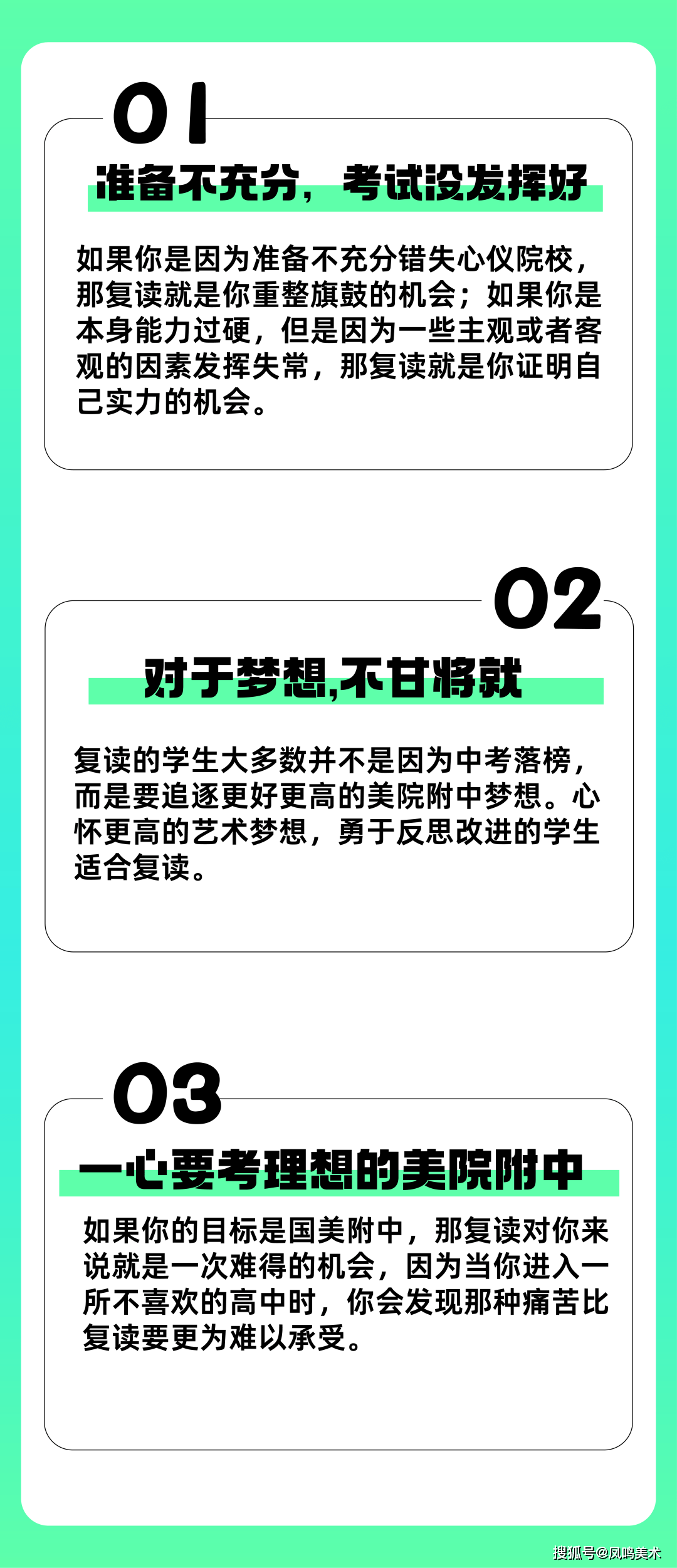 很多同学选择复读的原因是因为不甘心,希望能够通过自己的努力,去弥补上一次中考的失误,从而达到实现自己的艺术梦想,同时, 上一次的经验恰恰也是复读生们的优势。