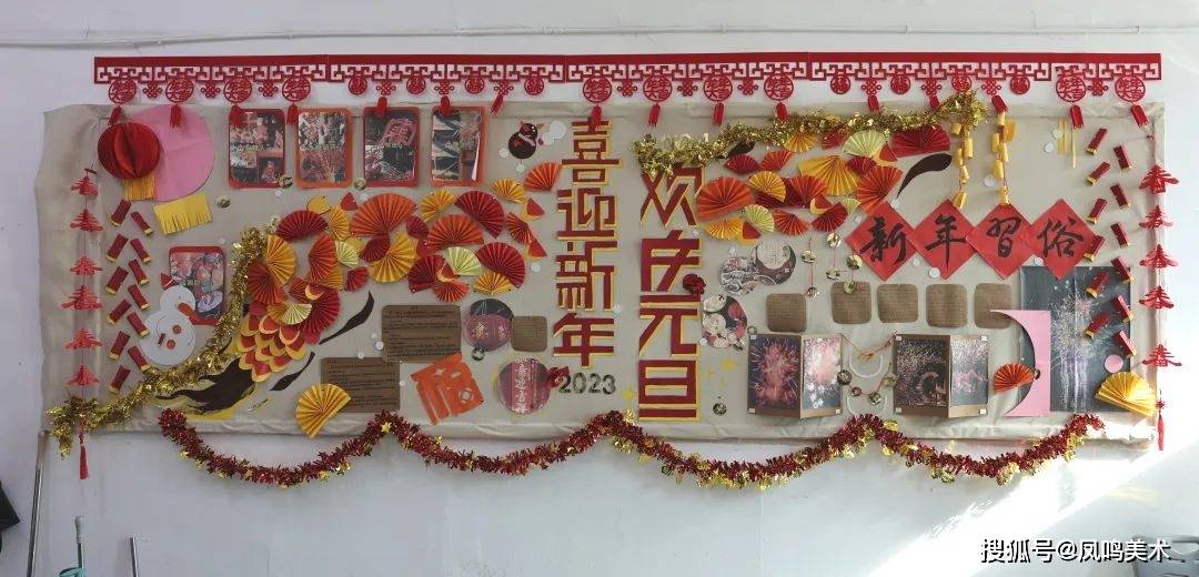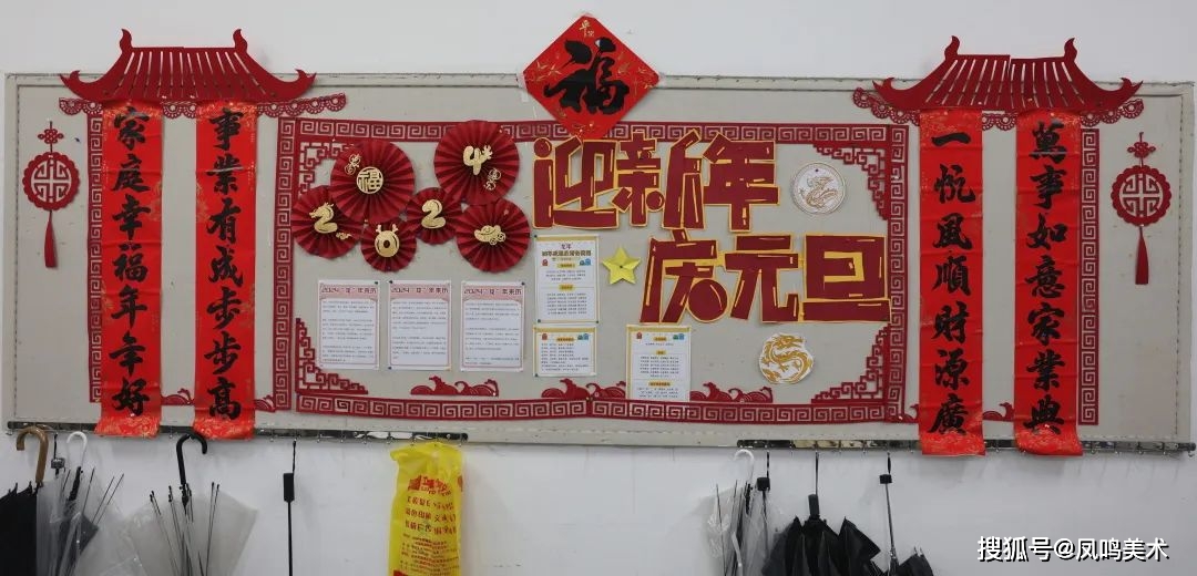 创作感想:本次黑板报设计活动是以新年喜庆氛围为基,选取大量红色元素来展现热闹的气氛。背景的扇子拼成了龙的形状,寓意着对即将到来的龙年的期盼。两侧的鞭炮和烟花象征了迎接新年的热情。