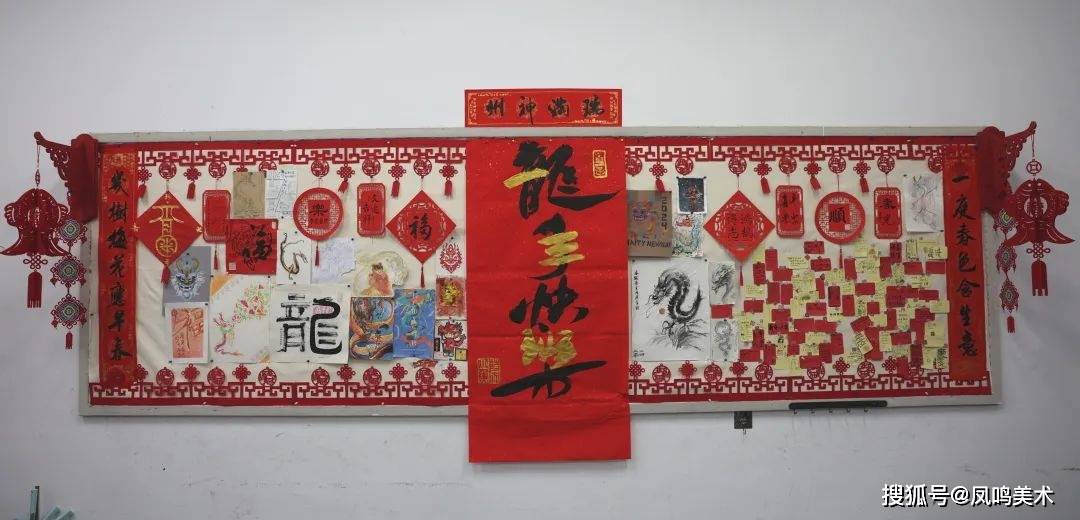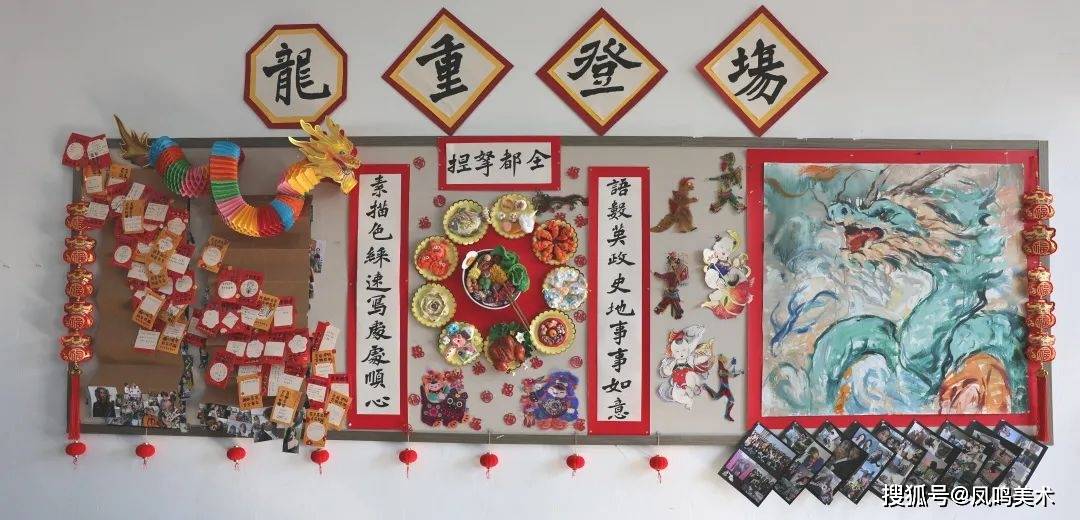 创作感想:板报的外框是一个中式房子的样子,给在外求学的同学们一种家的感觉。左右两边是两副对联,都是祝福同学和老师们学业事业一帆风顺,家庭和睦。中间的部分是一些关于2024龙年的小知识和有关龙的成语谚语积累。这次的板报设计本意是让同学们能在富有年味的黑板报中学到一些小知识,让板报起到一个教育的作用。