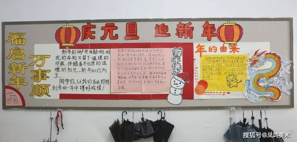 创作感想:黑板报以红,橙,黄三种鲜艳明亮颜色为主,以神龙,红灯笼和年兽经典年元素为点缀,加以一则有趣小故事和对新年的祝福。全程为手工制作,以大方简约美为主,整体单调不失设计。