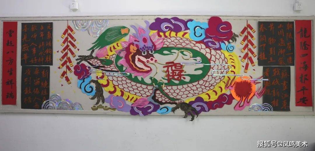 创作感想:板报取名为“龙腾四海”,意在龙征万里吉祥瑞。以蔚县剪纸为主体,河北省蔚县剪纸在构图及色彩上有自己独特的风格,本次选用的剪纸龙首龙尾相连成圆,聚气凝神。为了融合进大版面的黑板报,运用了多种不同材料,以织布为底,剪纸为装饰,为了增添参差色彩,用镭射材质剪出多种祥云环绕龙身。龙年即将来临,祝愿在新一年中,如巨龙一般四海征程。