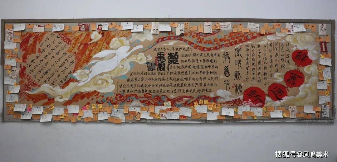 创作感想:黑板报以手绘的灯笼、祥云、玉兔、神龙等传统元素为背景,形成回环结构,寓意辞旧迎新,兔年即将与龙年交替;色彩以橙色、红色为主,明艳喜庆;文字由学生手书,包括行、楷、草、篆、隶五种通行书体;边缘处展示学生的新年愿望,也可作为一枚时间胶囊,在未来细细品味。