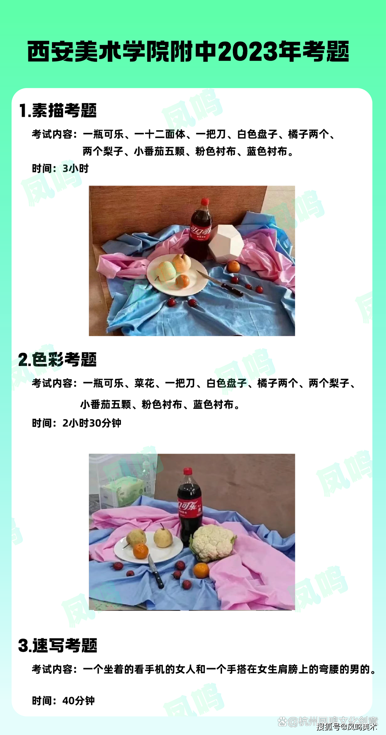 色彩:农夫山泉,苹果,彩椒,大白菜,玻璃瓶,葡萄;2、6开纸大小,考试时间3小时。