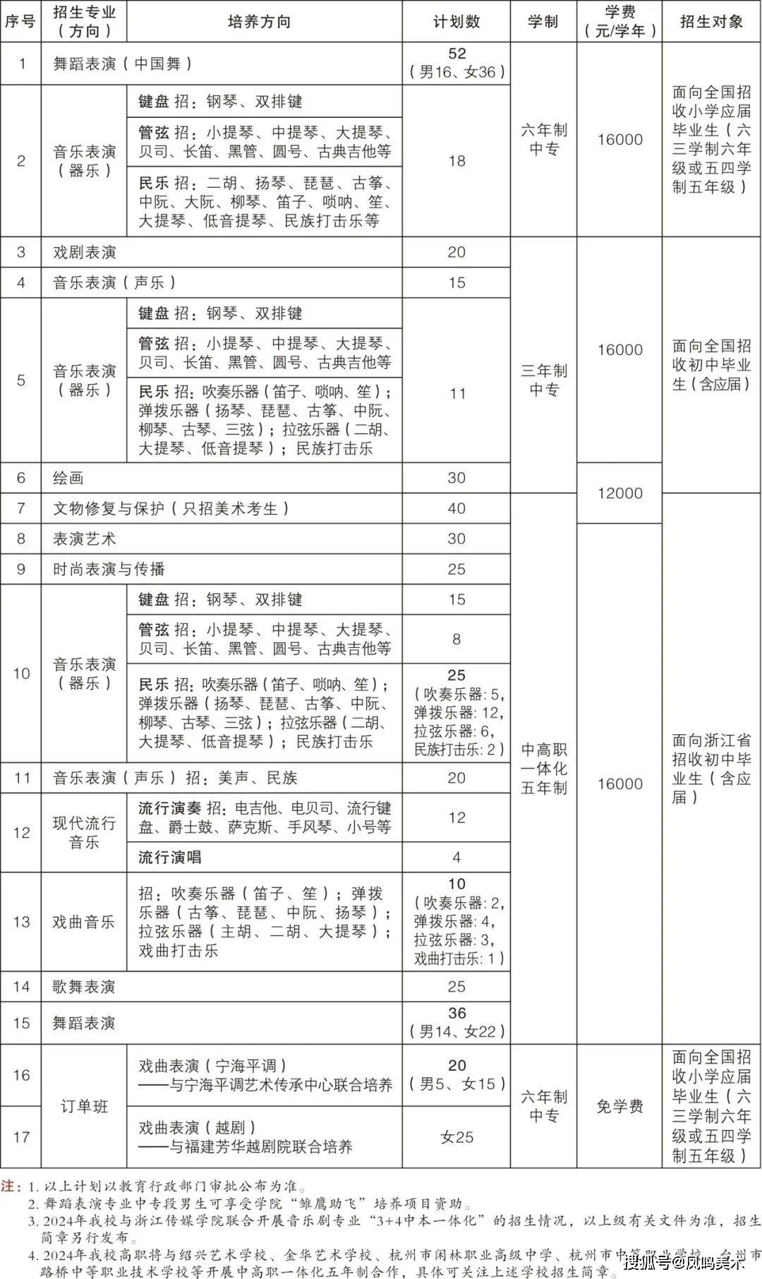 2024年六年制中专面向全国招收小学应届毕业生115人,三年制中专面向全国招收初中毕业生76人。三年制中专和六年制中专文化教学执行教育部普通中学课程标准,使用普通中学教材,高中阶段开设语文、数学、英语、政治、历史、地理等(文科类)课程,参加全省统一学考选考和高考,专业学习按专业培养方向开设专业课程,致力于为全国高等艺术院校输送优质生源。历届中专毕业生中,有大批学生考入北京舞蹈学院、中国音乐学院、上海音乐学院、中央音乐学院、浙江音乐学院、中央戏剧学院、上海戏剧学院、中国戏曲学院、中国美术学院等国内知名本科院校及其他综合类艺术院校。
