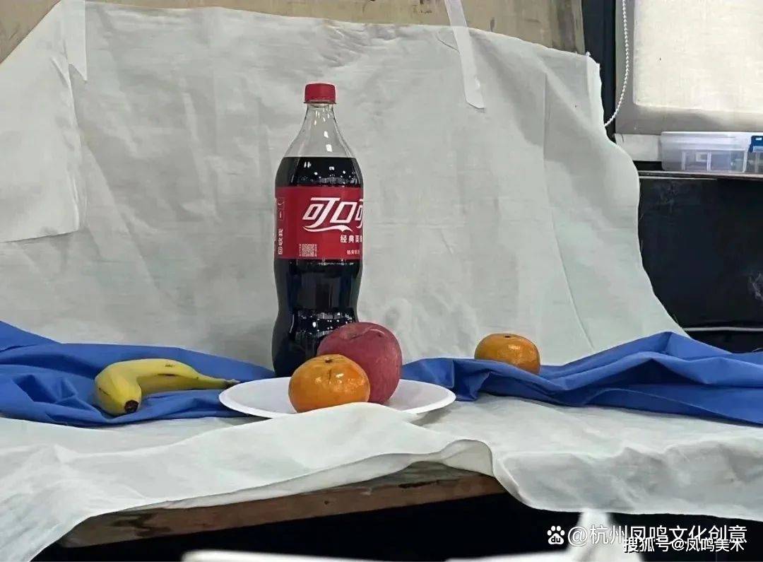 色彩:一瓶可乐、两个橘子、一个苹果、一个白盘子、一个香蕉、蓝衬布、白衬布,时间3小时
