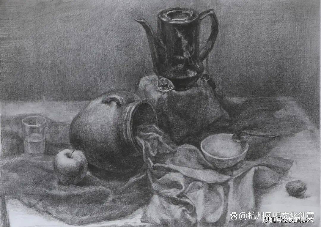 静物考题:陶罐一个、白色盘子一个、苹果一个、切半苹果一个,时间1.5小时,8开