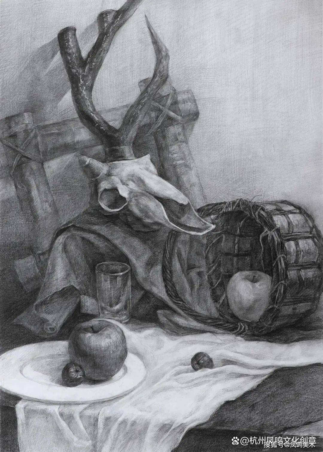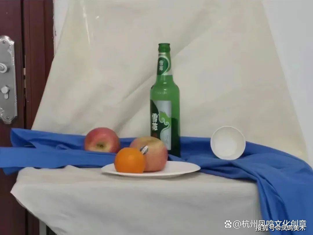 素描静物考题:啤酒瓶、两个苹果、一个橘子、一个纸杯、一个盘子、蓝衬布、白衬布写生,时间3小时