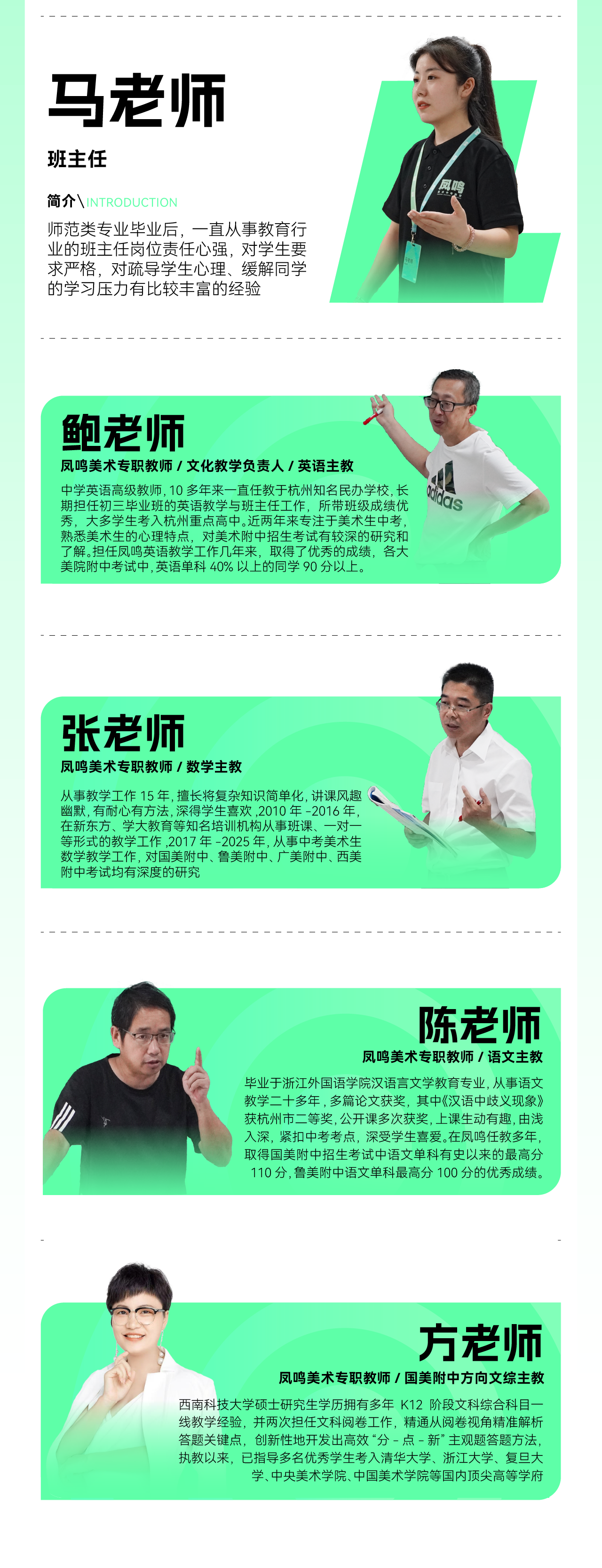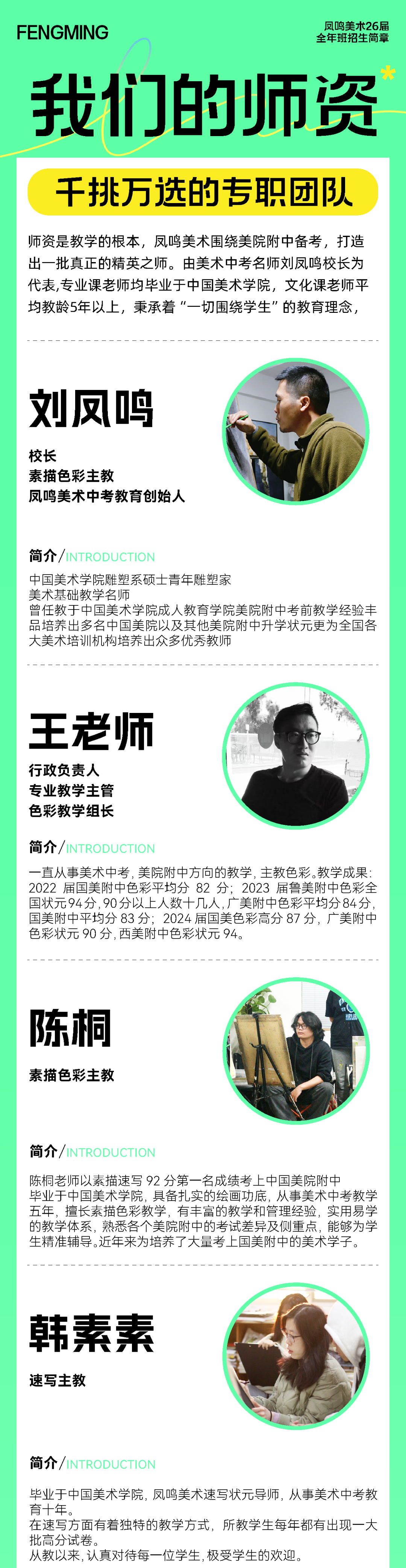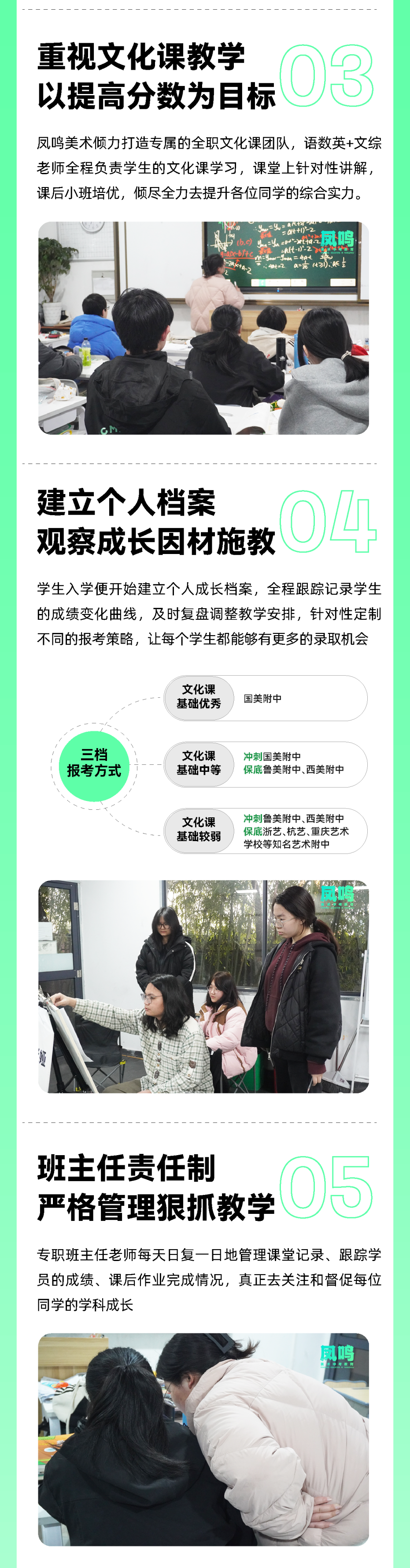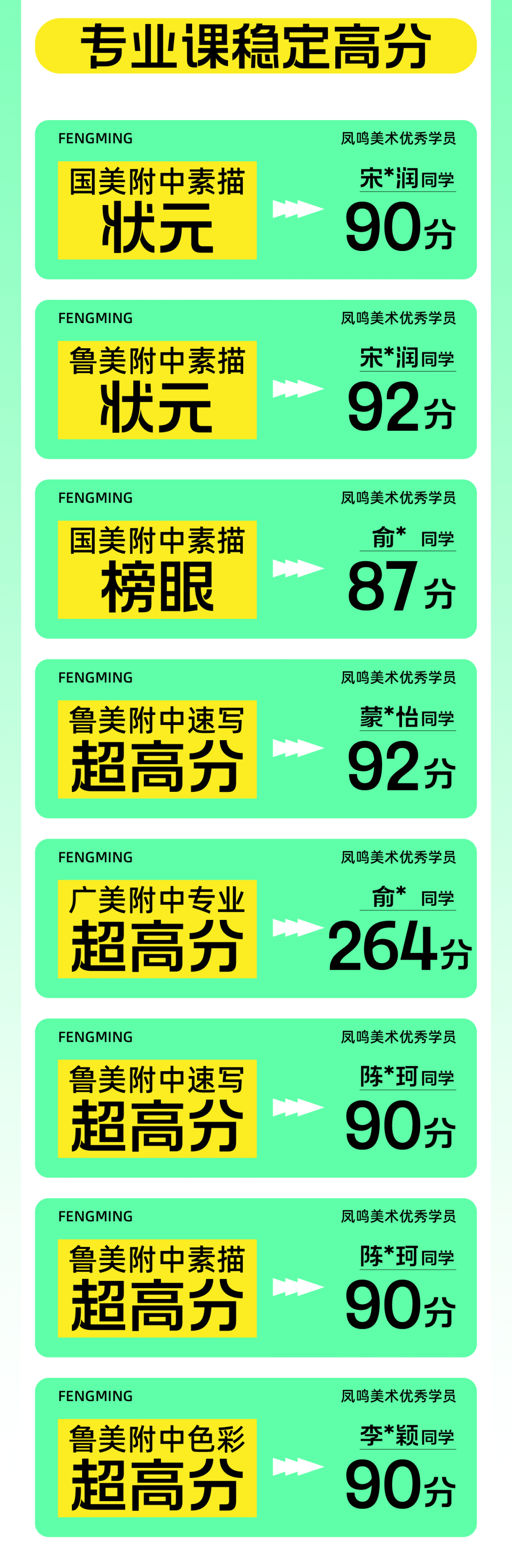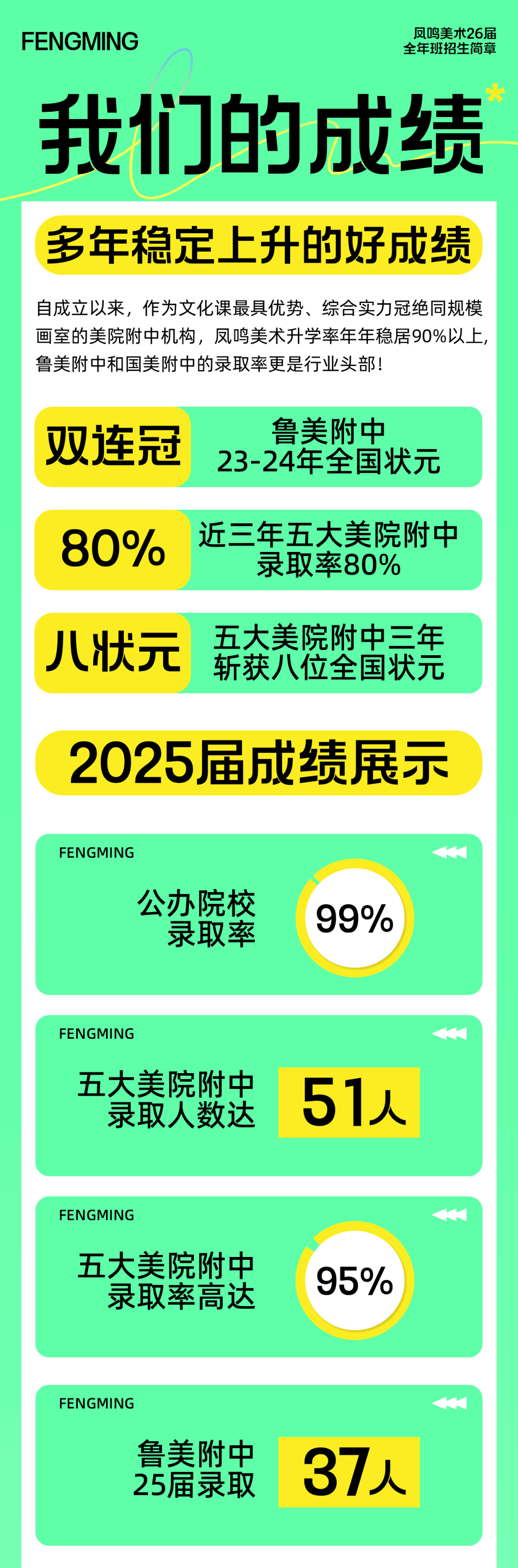 凤鸣美术办学20余年,拥有一支全职文化课团队和全职专业课教师团队,专业课老师全部来自中国美术学院,为各大美院附中输送了大量的优秀生源。分别在2023年,2024年连续获得鲁美附中全国状元,2024年获得国美附中文化课状元。